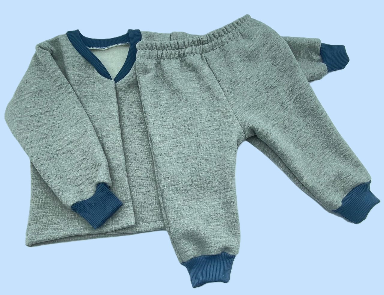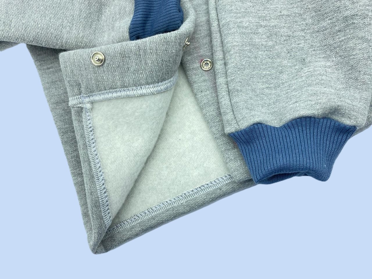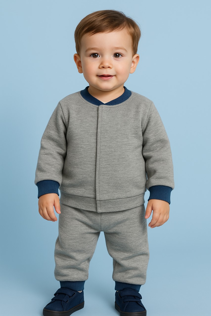 Conjunto de moletom infantil composto por blusa de manga longa e calça, ambos na cor cinza mescla. Os punhos e gola em ribana azul marinho adicionam um toque moderno ao look. O tecido é macio, quentinho e perfeito para os dias de temperaturas amenas ou frias, proporcionando liberdade de movimento e muito aconchego.